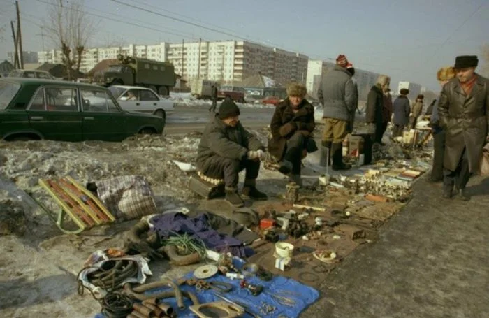 Таксисты у Курского вокзала. Москва, 1992 год.