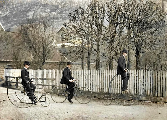 Трое мужчин на разных типах велосипедов. Королевство Норвегия, 1890-е годы.