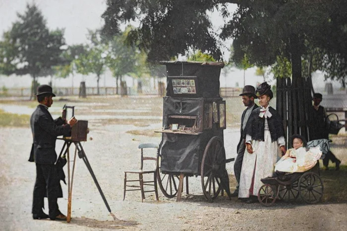 Уличный фотограф в парке снимает семью аристократов, ведь съемка в то время была очень дорогим удовольствием.