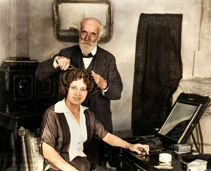 На снимке парикмахер М. Марсель, создатель прически Марселя, демонстрирует свое творение на женской модели.