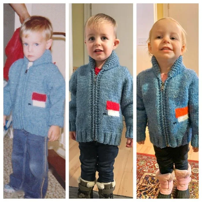 4. "В 1981 году я носил этот свитер, а теперь его носят мои сын и дочь в 2017 и 2020 годах соответственно"