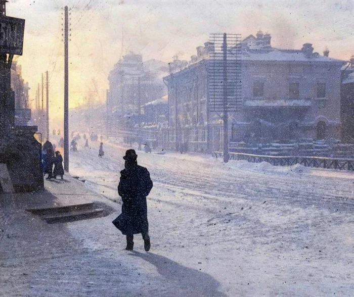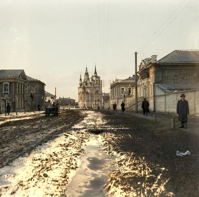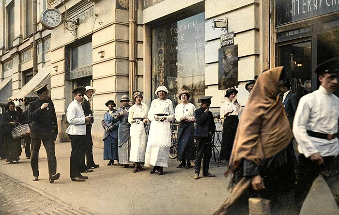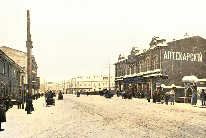 Снимок сделан уже в год революции. В городе становится все трудней доставать продукты и промтовары - у торговых точек выстраиваются огромные очереди.
