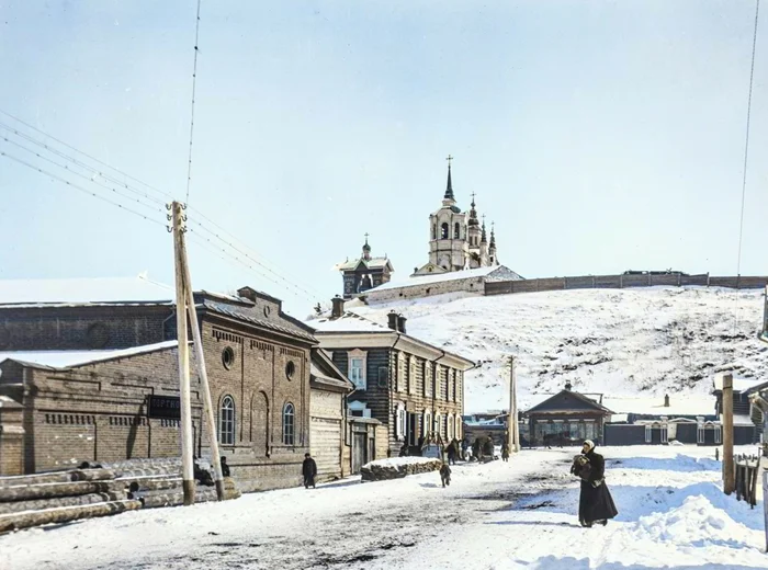 На фотографии также Юрточное мужское начальное училище, открывшееся в 1869 году. Это одна из первых томских школ. Рядом со школой - пожарная каланча.