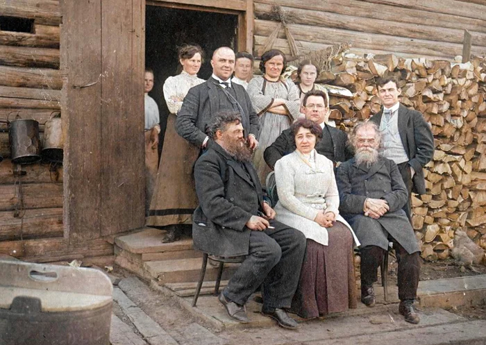 На фото - сидят: Григорий Потанин (справа) со своим учеником Александром Адриановым, журналистом, этнографом и редактором газеты «Сибирская жизнь» (слева). На заднем плане - дочери А. Адрианова: Вера. Мария, Нина, Надежда. Снимок сделан в усадьбе Адриановых на ул. Преображенской.