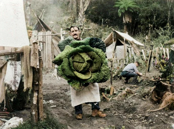 Повар держит гигантскую капусту в лагере в Wairarapa. Новая Зеландия, 1890 год.