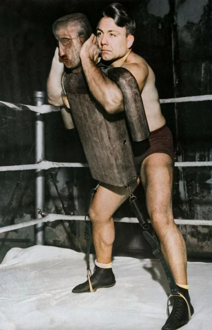 Американский борец Эверетт Маршалл отрабатывает борцовские приёмы на своём деревянном спарринг-партнере, 1936 год.