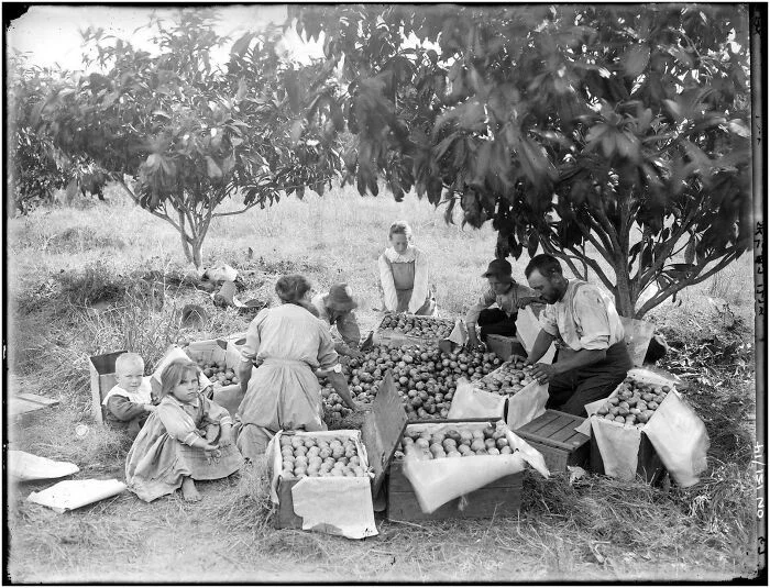 28. Семья Сонтер упаковывает фрукты. Рэй Роуд, Сидней, 1911 год. Фото Рекса Хэзлвуда