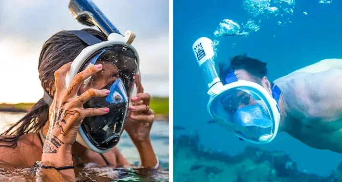Эта маска позволяет легко дышать под водой через нос и рот, обеспечивая полный обзор на 180 градусов.