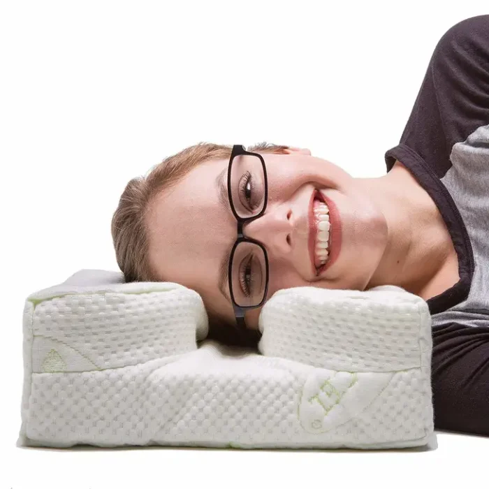 Специальная подушка с выемкой для очков обеспечит комфорт при просмотре телевизора в положении лёжа на боку.