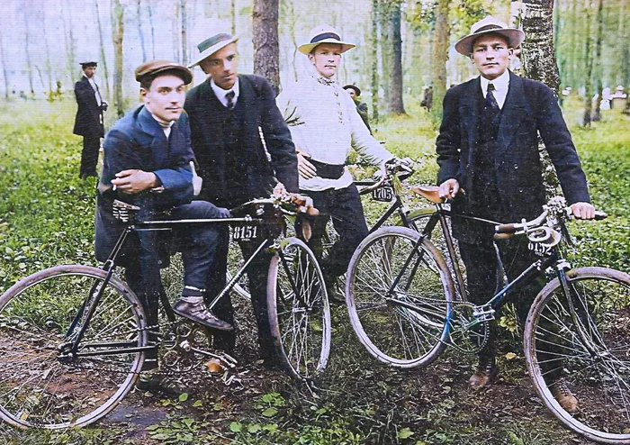 Все велосипеды без крыльев. Это что же с костюмом станет после поездки... Также у всех номера на раме. В этот период существовало Немчиновское спортивное общество, возможно эти ребята оттуда.