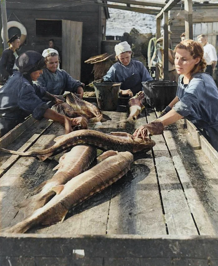Женщины чистят осетра в доках. Сталинград, август 1947 год.