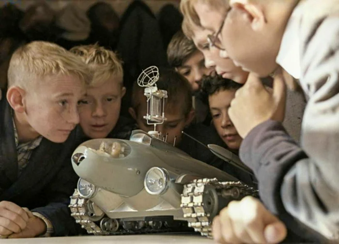 Ребята рассматривают модель детской игрушки «Лунника», 1963 год.