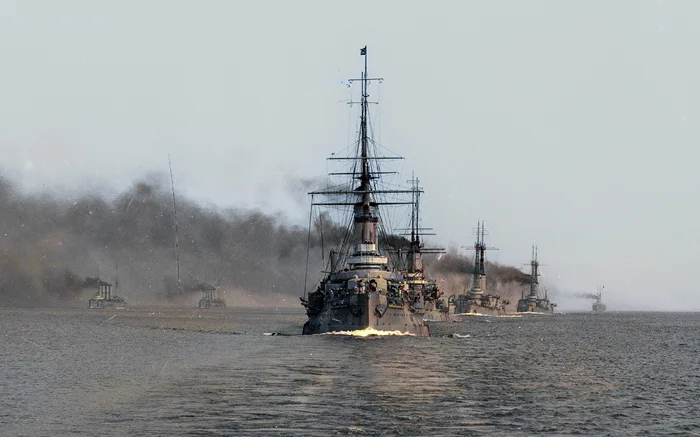 На переднем плане 2-я бригада линейных кораблей под флагом вице-адмирала Людвига Кербера - броненосцы "Цесаревич", "Слава", "Андрей Первозванный" и "Император Павел I".К 1917 году Российская Империя строила больше линкоров чем Англия.