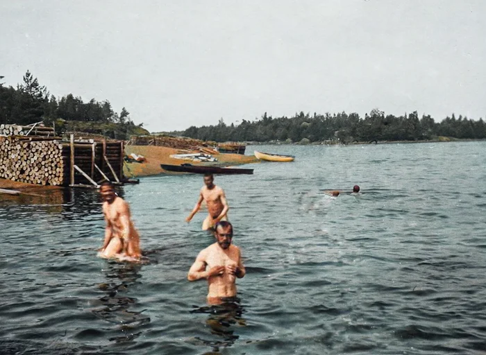 Николай II купается во время отдыха в Финляндии, 1912 год.