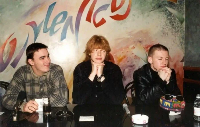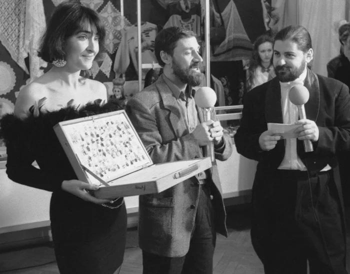 18. Ведущие телепрограммы «Тупица» Лолита Милявская и Александр Цекало во время представления ювелира из Москвы Сергея Сагайдачного, 1991 год.