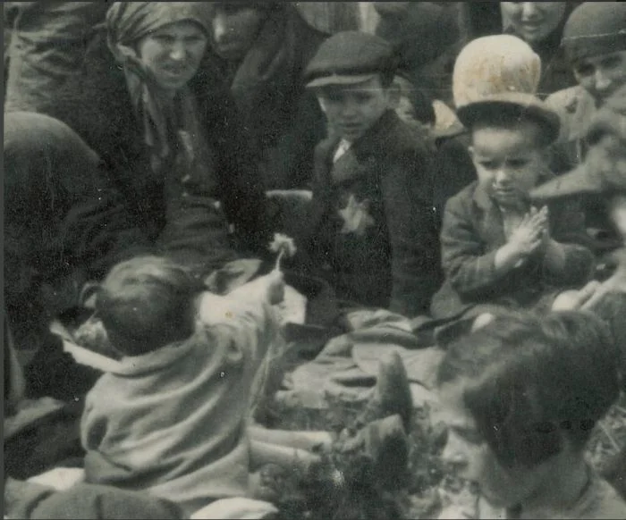Снимок был сделан почти 80 лет назад, скорее всего, в конце мая 1944 года. Маленький ребёнок нашёл в траве одуванчик и передает или показывает его мальчику постарше.