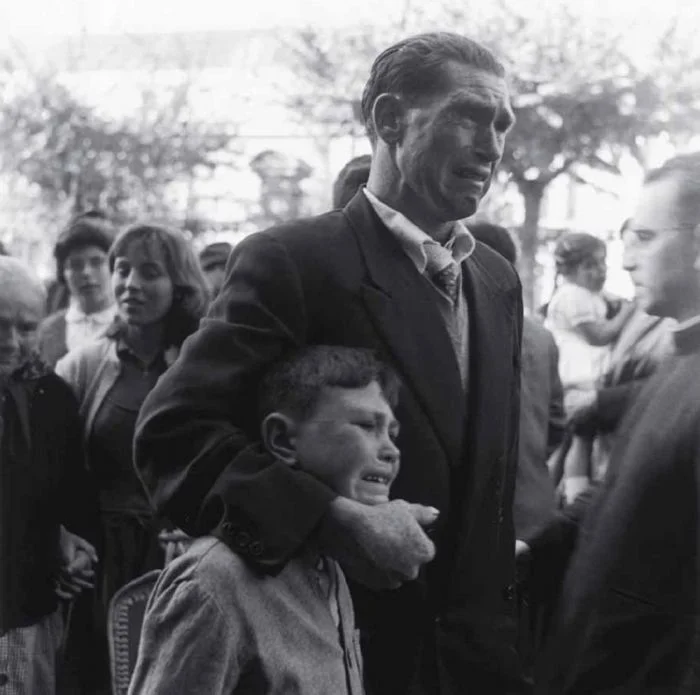 12. Отец и сын плачут, прощаясь с родственниками, которые садятся на корабль в Буэнос-Айрес в поисках лучшей жизни во время экономических трудностей в Испании