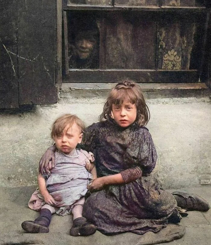 Семилетняя Энни и годовалая Нелли сидят возле своего дома в Лондоне. Их мать-одиночка Энни Дэниелс родила десять детей, пять из них умерли в раннем детстве.