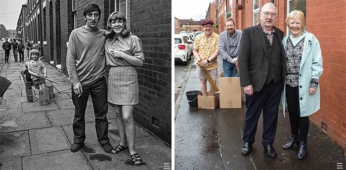 27. Тогда и сейчас, 1970 и 2024. Семья воссоздала снимок 54 года спустя в Солфорде, Англия