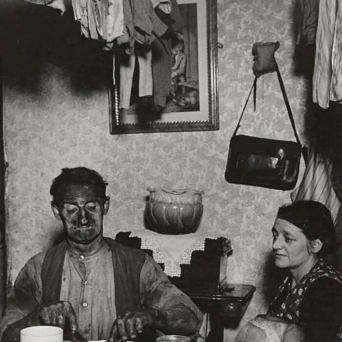 30. Английский шахтёр за ужином со своей женой после долгого рабочего дня, 1937 год