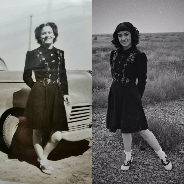 6. Фотография моей бабушки в вышитом и сшитом ею самой платье. А я, более 70 лет спустя