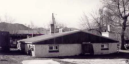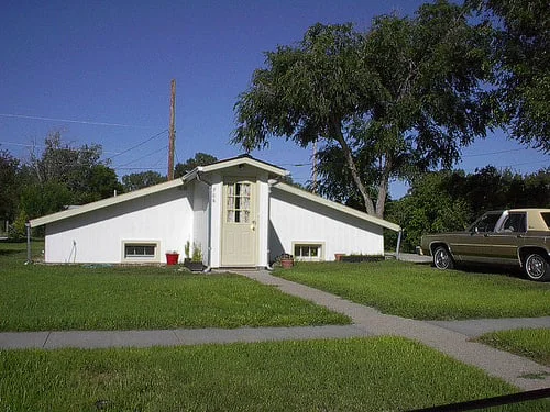 Это "подвальный дом". Просто обычный жилой дом, но изначально построенный как подвал, в земле. После второй мировой в США началось сильное развитие пригорода, и возникла проблема с жильем. Такие дома считались доступными по цене, легкости создания, теплу. Типа стены не надо сложные делать, ямку выкопал, бетоном залил, тонкие стенки поставил и живи себе. Разбогател? Ставь этаж сверху. Лестница, конечно, сразу вела вниз, в подвалодом. Они считались подходящими для ветеранов и молодежи. Сейчас почти все уже достроены, но некоторые нет, вот как на картинках. Затапливало? Да, бывало. Ну вы же "Паразитов" смотрели? Там так же топило.