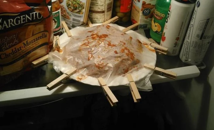 9. Вот как мой муж хранит остатки еды в холодильнике