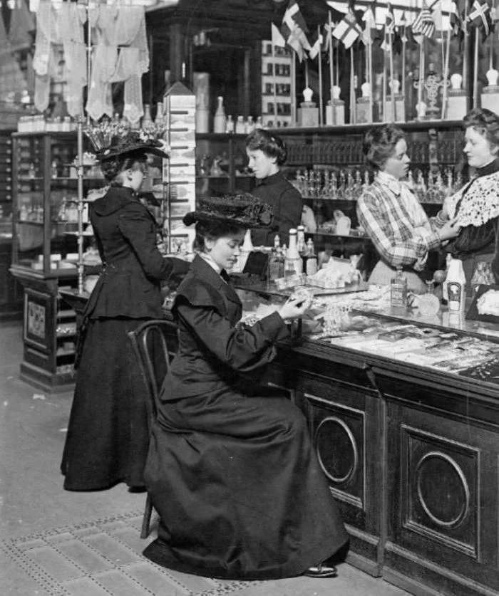 10. Женщины приобретают косметику и украшения в универсальном магазине Illum в Копенгагене, Дания, 1904 год
