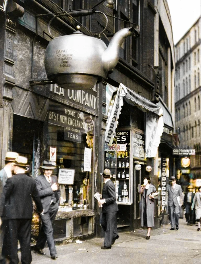 Огромный чайник над дверью восточной чайной компании на Сколлэй-сквер, Бостон, 1934 год.