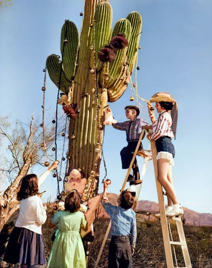 Дети из аризонской пустыни наряжают на Рождество кактус из-за отсутствия ёлки. США, 1959 год.