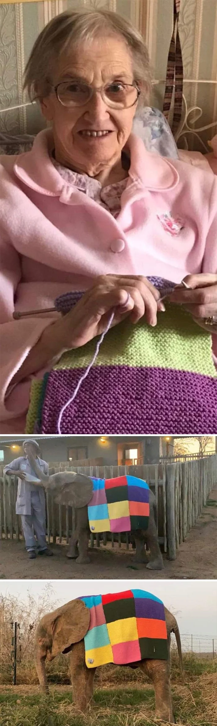 4. "Бабуля связала плед для слоненка в Южной Африке. Четыре месяца спустя он доехал до места назначения, и она просто счастлива"