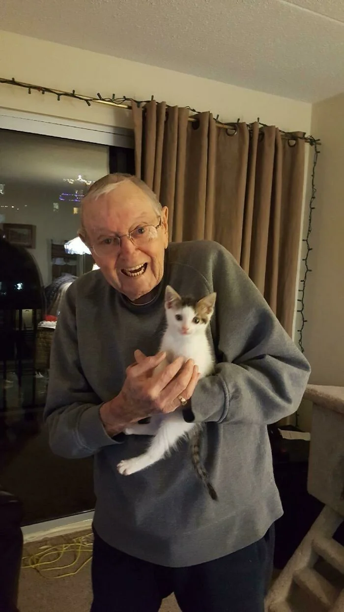 15. "В декабре у дедушки умерла кошка. Он был убит горем и не хотел заводить другую, но ему было очень одиноко. Мама помогла найти ему котенка, и вот фото, которое он мне отправил"