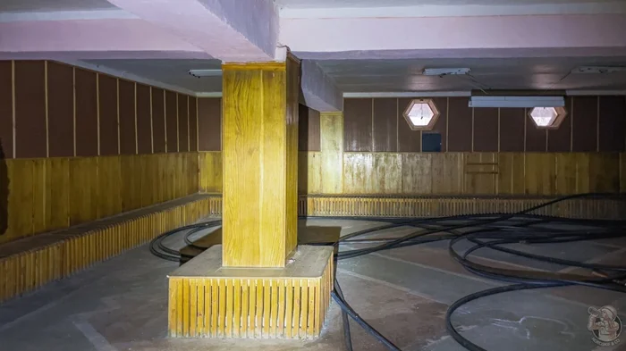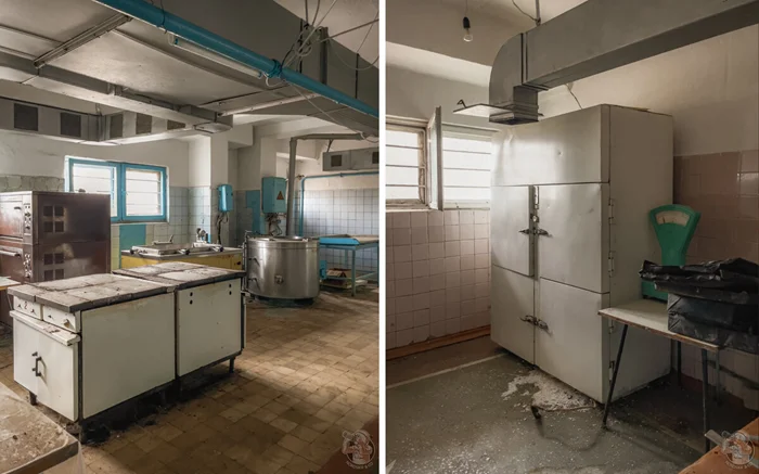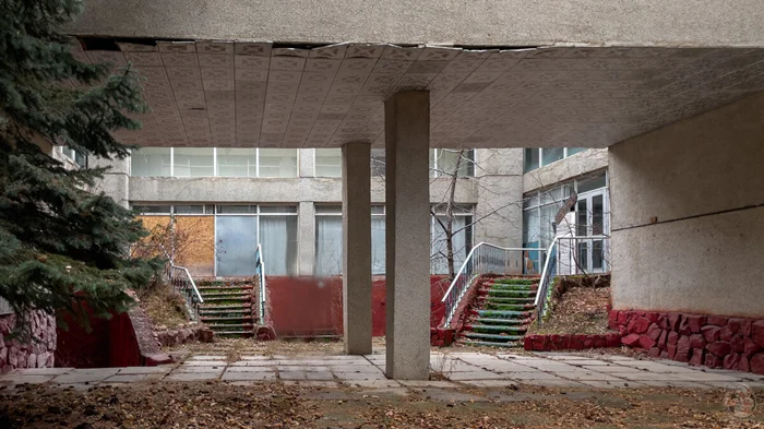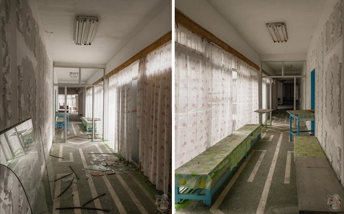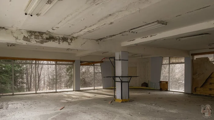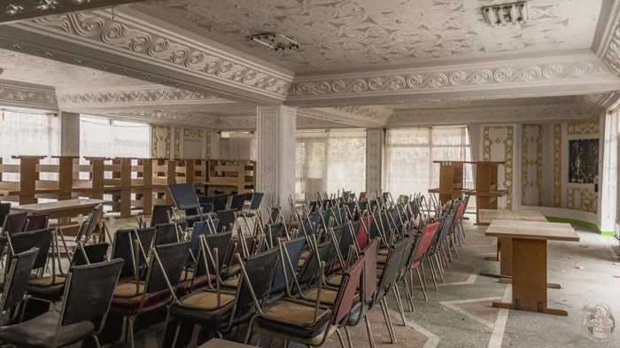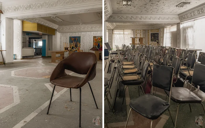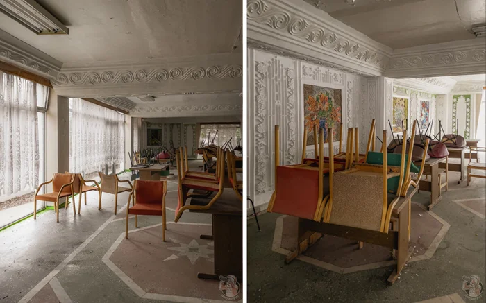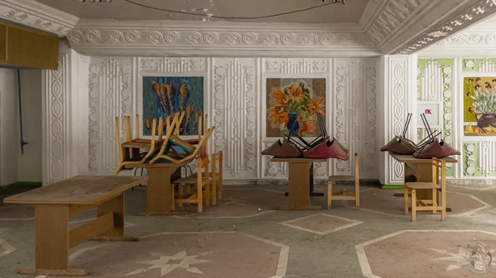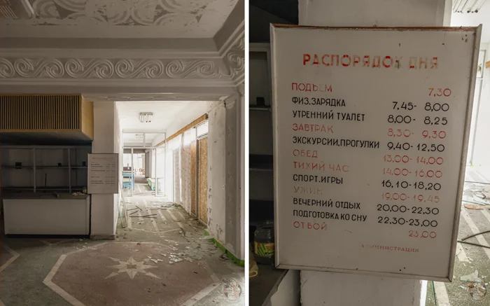 Столовая относилась к ныне закрытому советскому пансионату, о котором напоминает сохранившийся на стене распорядок дня.