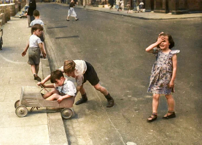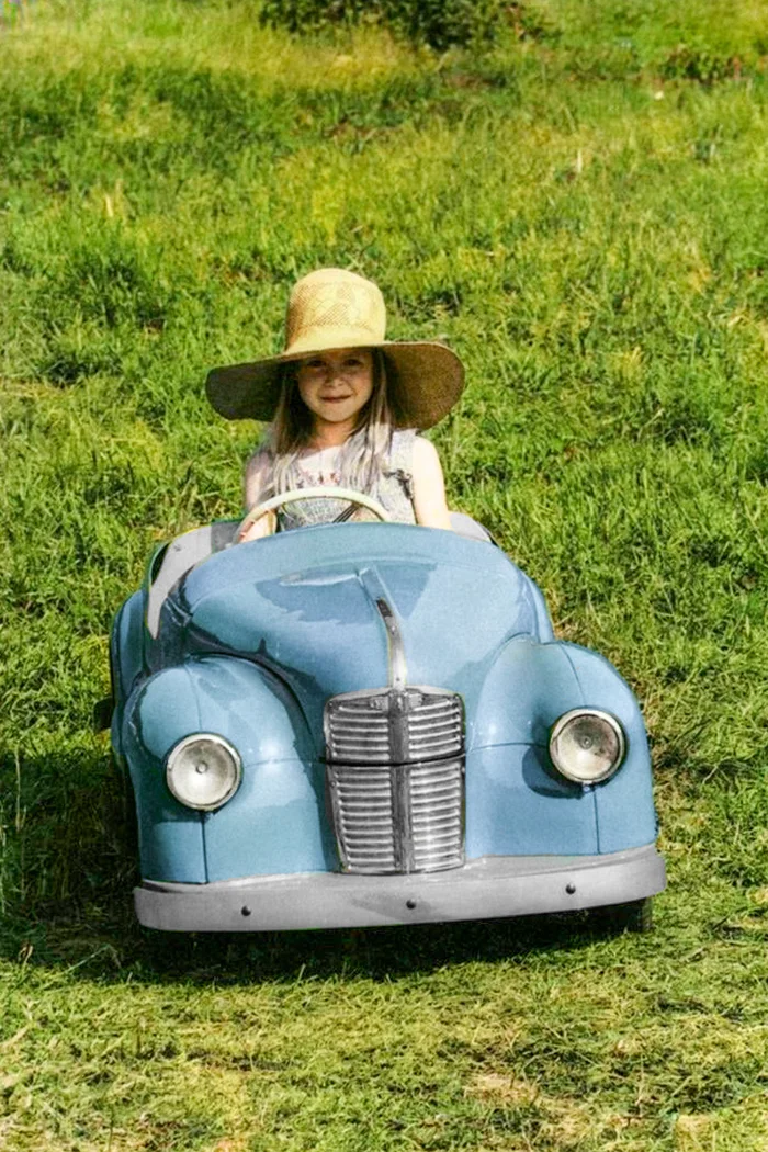 Девочка в педальном автомобиле Austin J40, 1950-е годы.