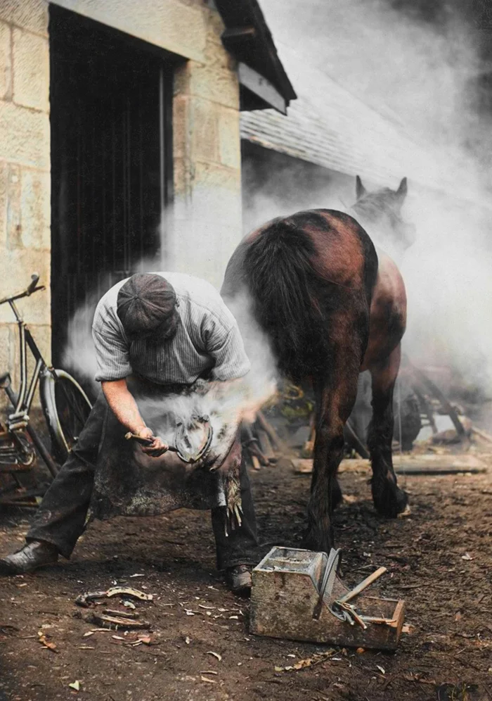 Копыто расчищено, идет горячая подгонка новой подковы. И поныне некоторые ковали делают так же. Кстати лошадь, похоже, ломовая, на подкове хорошие грунтозацепы видны. А снимок получился весьма эффектным.