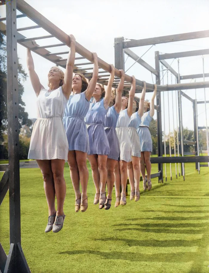 Иностранные учащиеся на уроке физкультуры на открытом воздухе в англо-скандинавской летней школе в Милнер-Корт, Старри, Кент, 1935 год.