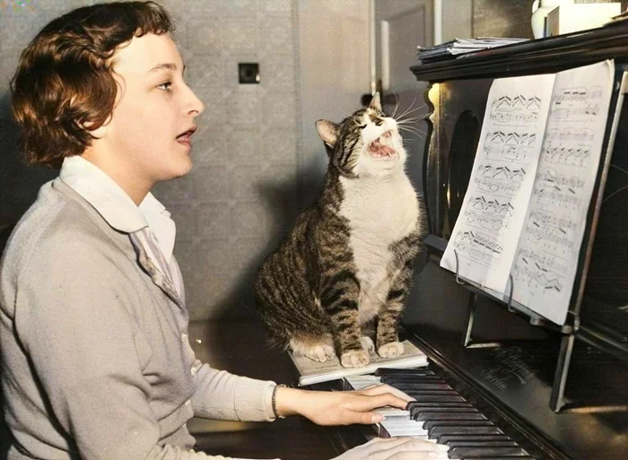 Кот, обожающий музыку, подпевает хозяйке в Вустере, Англия, 1959 год.