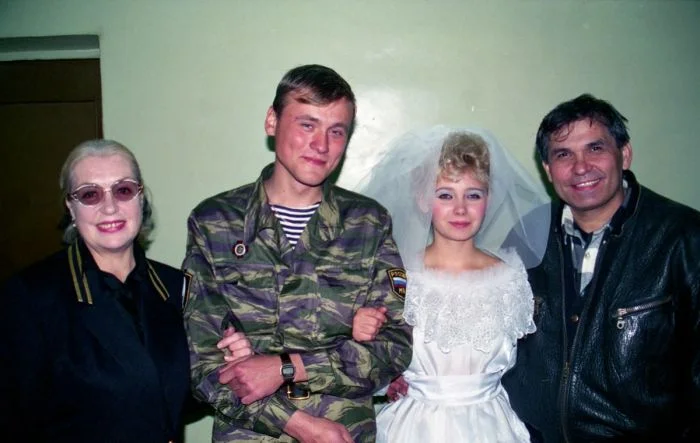 3. Лидия Федосеева-Шукшина и Бари Алибасов на свадьбе российского солдата Станислава Титова во время гастролей с группой «На-На» в Чечне, 1996 год.