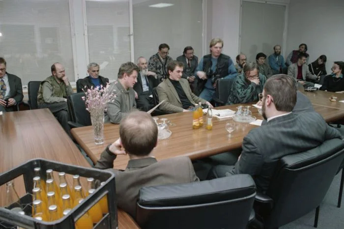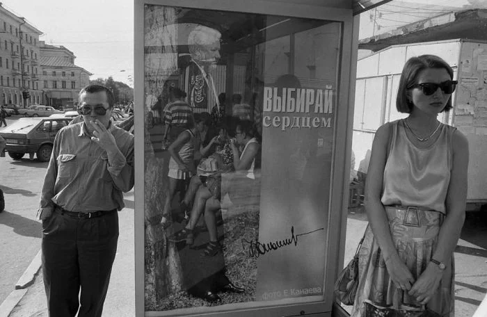 21. Задумчивые люди на остановке. Казань, 1996 год.