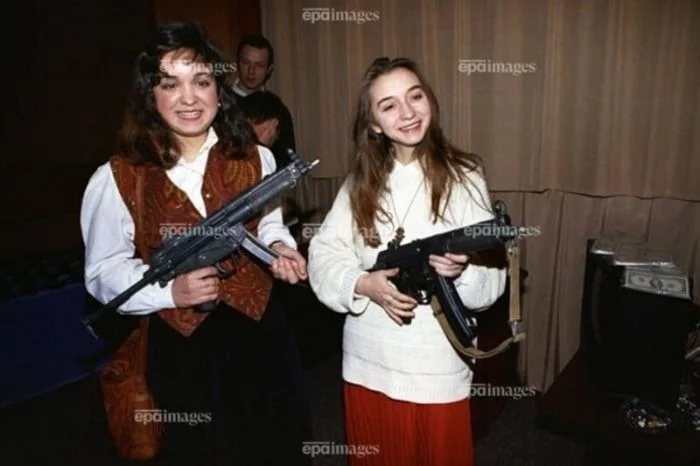 18. Молодые девушки демонстрируют журналистам пистолеты-пулеметы, конфискованные сотрудниками ФСБ, на выставке, посвященной первой годовщине ФСБ. Москва