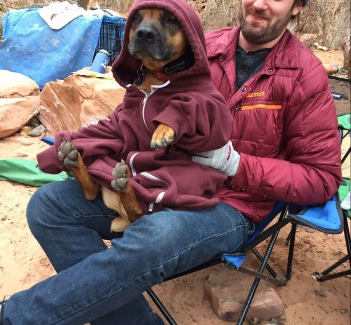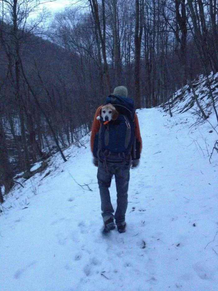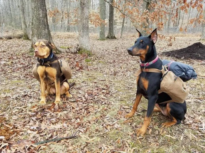 Любители походов: один несёт собачью еду, второй – спальные мешки для собак и другие припасы