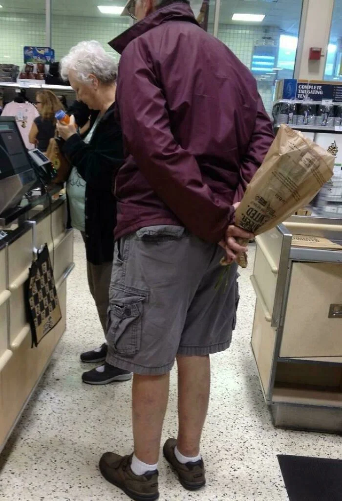 13. "Мы стояли в большой очереди в продуктовом. Этот мужчина сказал, что ему надо в туалет, но на самом деле сбегал купить жене цветы и спрятал их за спиной"