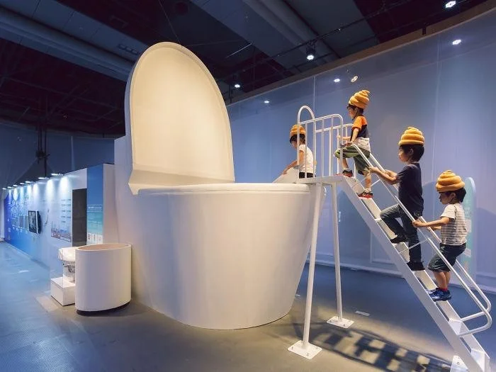 30. Дети в шляпах в форме какашек спускаются в гигантский туалет. Выставка в Токио