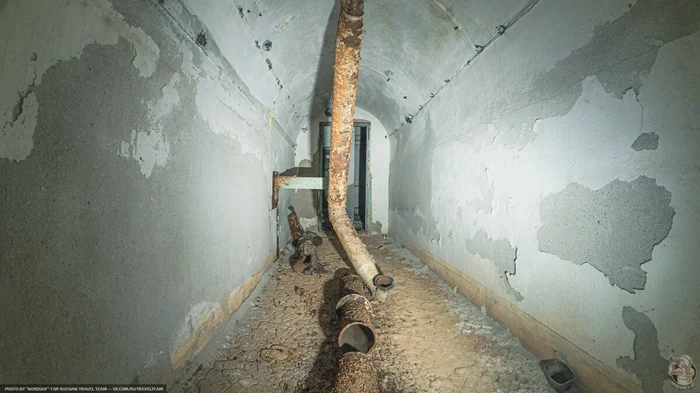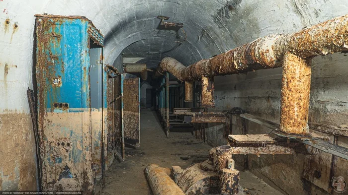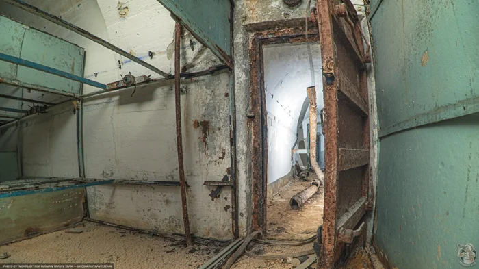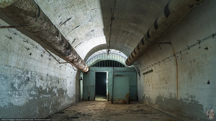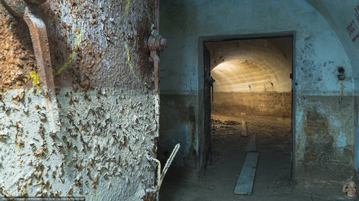 Бомбоубежище разделено на отсеки самыми простыми, относительно тонкими гермодверями на манер тех, что обычно ставили в гражданских убежищах под «домами сталинками». На фоне многотонных дверей в скальных убежищах Севастополя они выглядят совсем крохотными.
