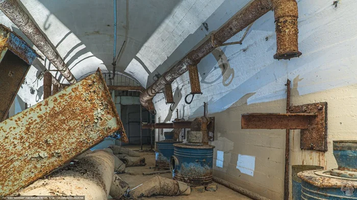 Фильтр-вентиляционный комплекс дошёл до наших дней в удручающем состоянии и только окрашенные в синий цвет фильтра, чуть поднимают настроение необычным цветовым решением. Такие «бочонки-фильтра» с завода идут исключительно в темно зелёной расцветке.