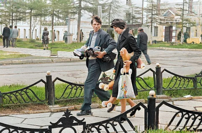 Докер Магаданского порта Юрий Мусин и его супруга несут игрушки, купленные для своих детей. Магадан, 1980 год.