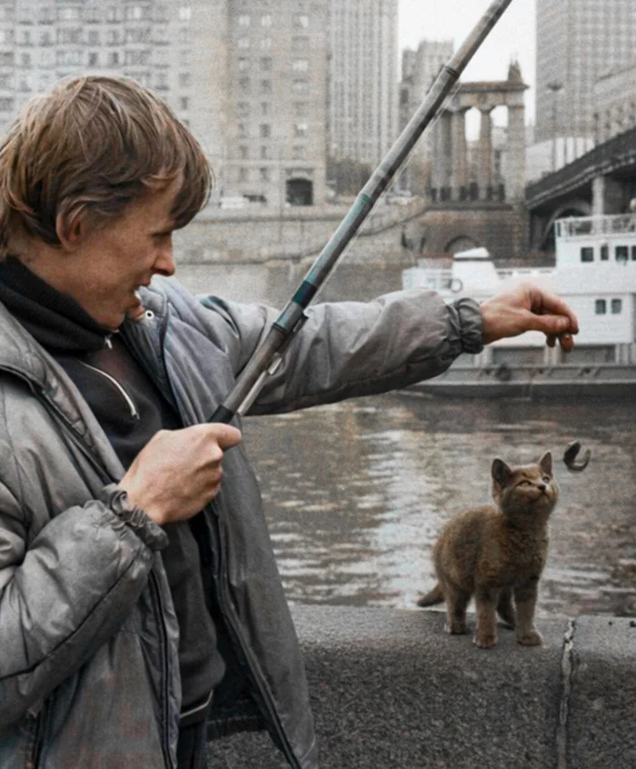 Рыбак и кошка на набережной Тараса Шевченко. Москва, 1987 год.