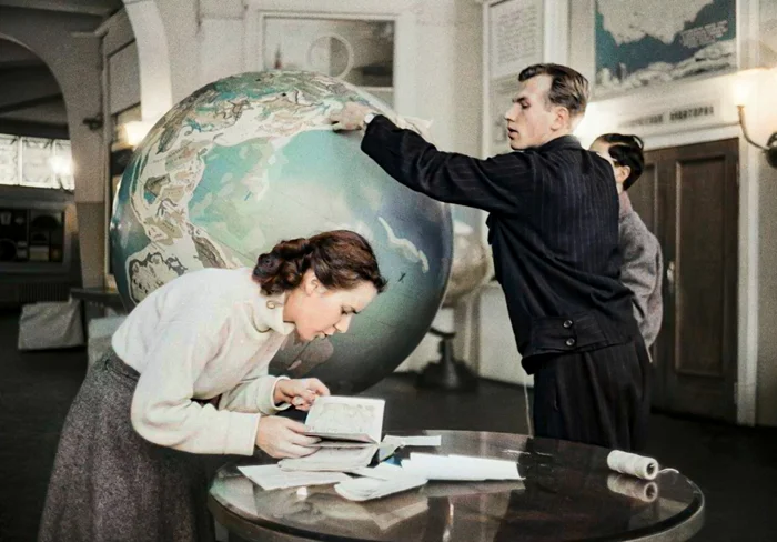 Работники Московского Планетария наносят траекторию движения спутника на большой глобус, 1957 год.