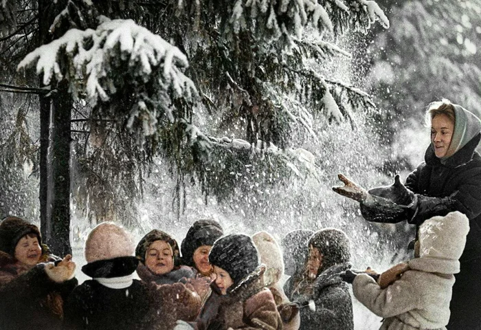 Развлечение для любого возраста зимой, когда на ветках много о снега дернешь— за ветку и ловишь снежную лавину. Шубки и шапки у детишек это прям ностальгия и куда же без варежек на резинке.