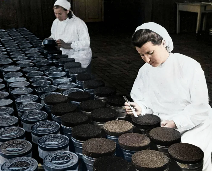 Контролеры А. Андреева и М. Мысова проверяют качество икры перед упаковкой на экспорт. Отделение Кировского рыбного хозяйства в Азербайджане, 1947 год.
